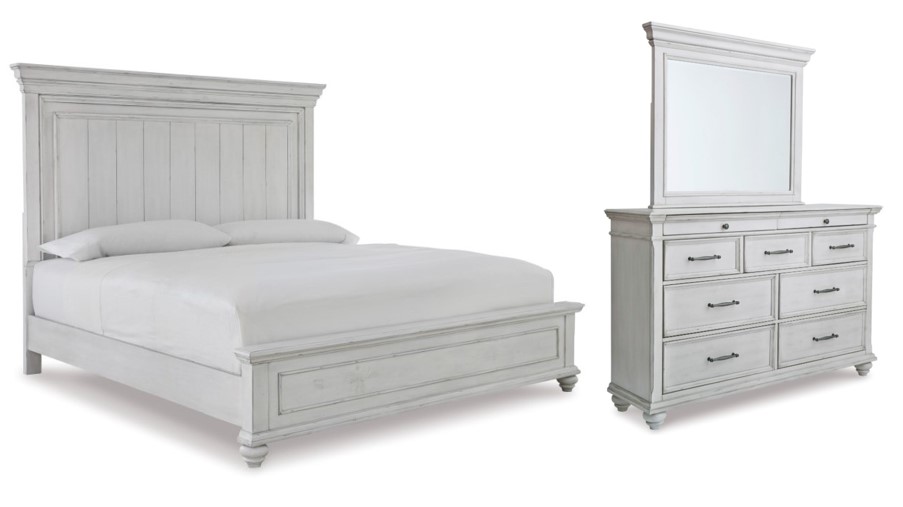 Give your retreat vintage charm with this king panel bed and storage footboard. In a beautifully distressed whitewash finish, you'll love the headboard's grand style featuring a picture framed panel. The bench footboard is equally elegant offering extra storage and a convenient seat.