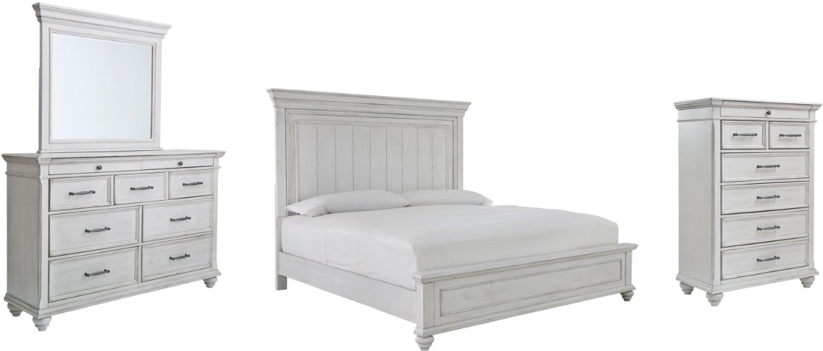 Includes king panel bed (headboard, footboard and rails), dresser with mirror and chest