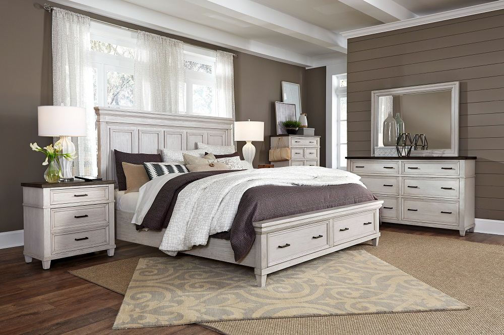 Caraway represents a farmhouse style that is warm and approachable in a wirebrushed Aged Ivory finish with contrasting brown finish tops. Enjoy a wide array of special features such as built-in power outlets and charging ports, hidden drawers, valet rods, felt and cedar lined drawers and more.