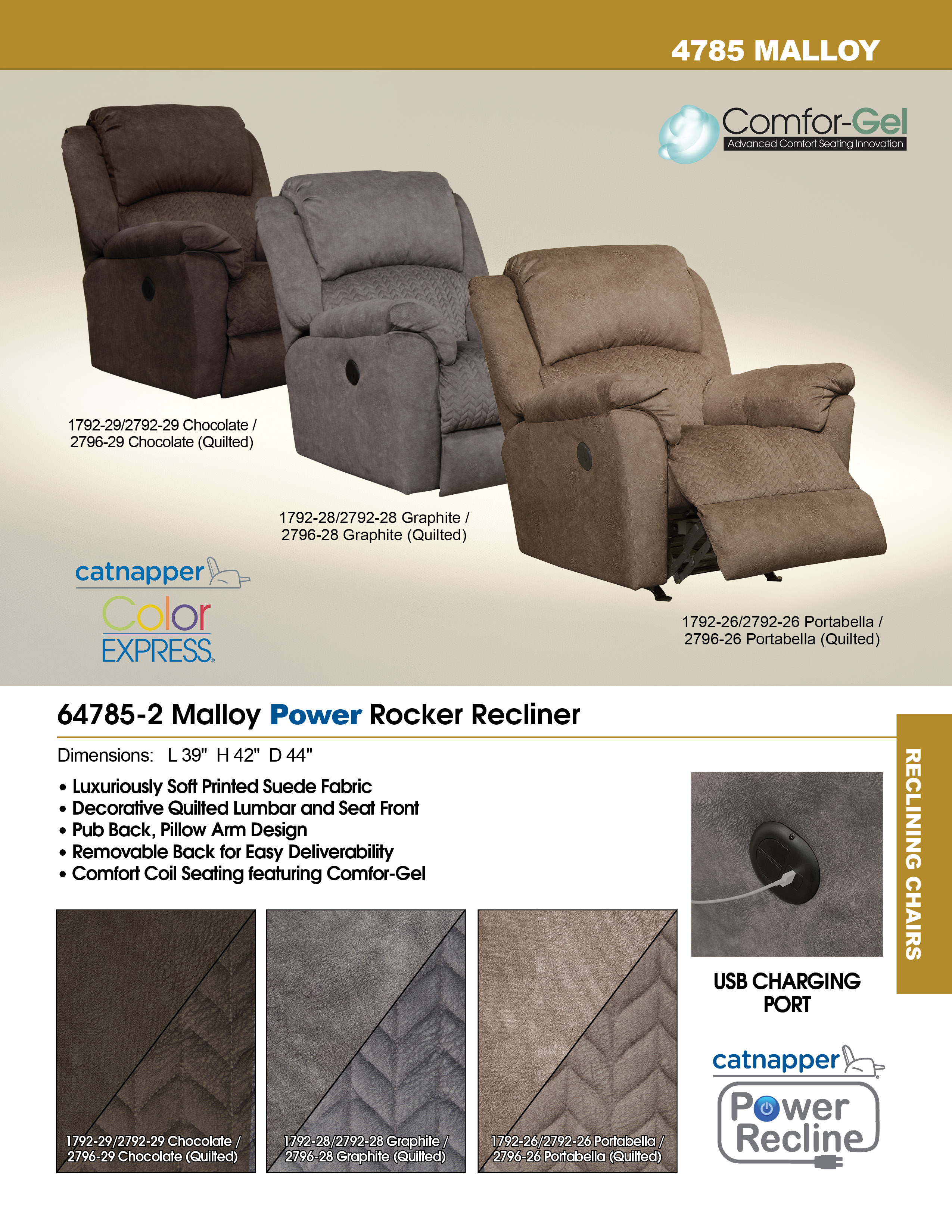 The Malloy Graphite Power Rocker Recliner features a decorative quilted lumbar and seat, as well as, a pub back and pillow arm design. The luxuriously soft printed suede fabric paired with the comfort coil seating featuring Comfor-Gel create an extremely comfortable seat.Read More