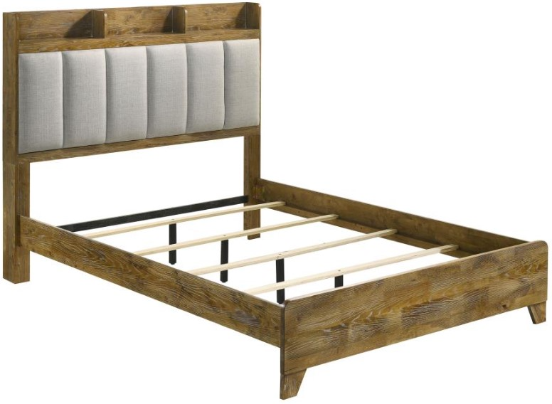 Rustic warmth meets thoughtful design in this queen bookcase panel bed, crafted to bring both comfort and character to your bedroom retreat. The tall headboard features a soft vertical upholstered panel in light grey, framed by rich wood grain textures in a warm medium oak finish.Read More
