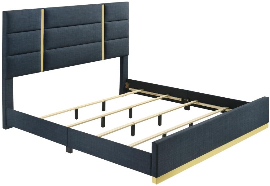 The footboard features a matching gold base detail that adds polish from every angle. Wrapped in soft woven fabric and built on a durable frame, this bed delivers luxury, structure, and long-lasting support.