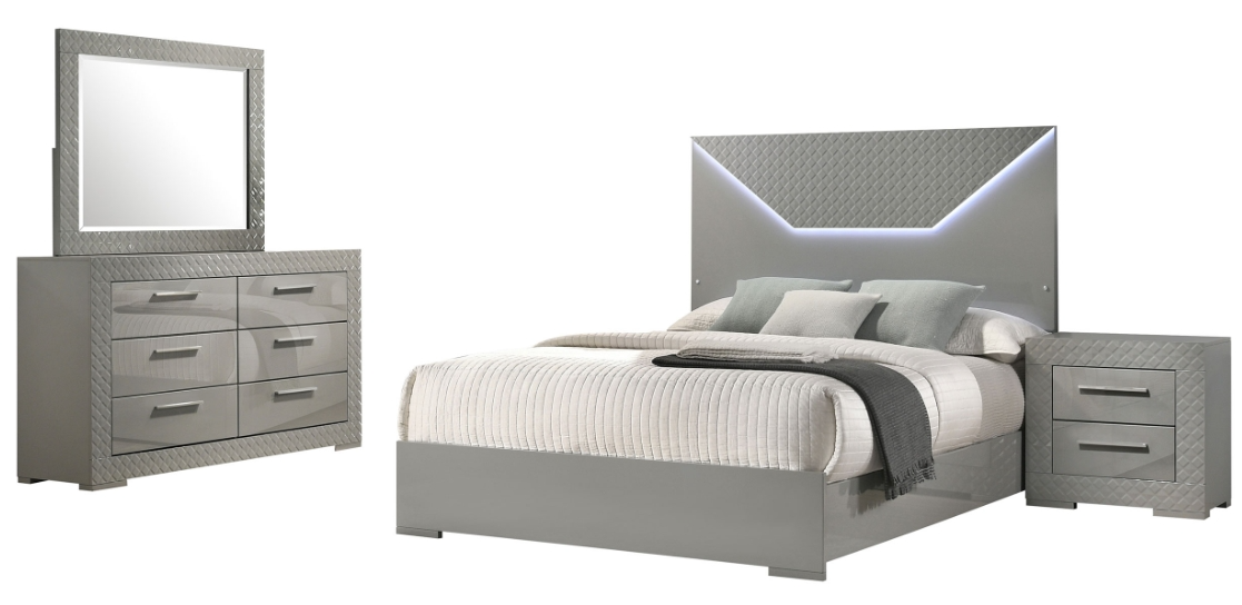 Create a cohesive and stylish look in your bedroom with this four-piece set, including a bed, nightstand, dresser, and mirror. The set features a high gloss finish and 3-dimensional diamond tile emboss, reflecting a contemporary Italian style. Each piece is crafted with quality materials and attention to detail, offering both beauty and functionality.Read More