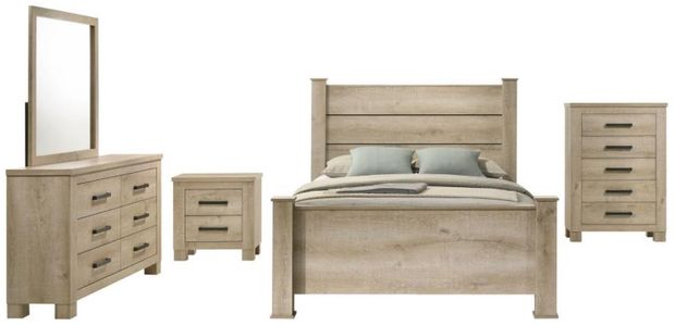 Includes: One (1) California king bed, one (1) nightstand, one (1) dresser, one (1) dresser mirror, and one (1) chest