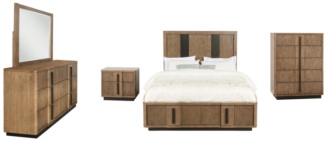 A modern bedroom set includes a bold wooden five-piece queen bed with two storage drawers in its footboard