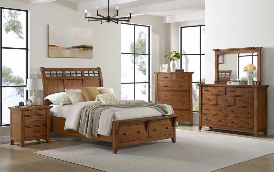 The Gage in Chestnut is poised with the grace and refinement of traditional style. Constructed from fine solid and engineered wood, this piece is as durable as it is timeless. Windowpane detailing on the sleigh headboard creates a unique focal point.