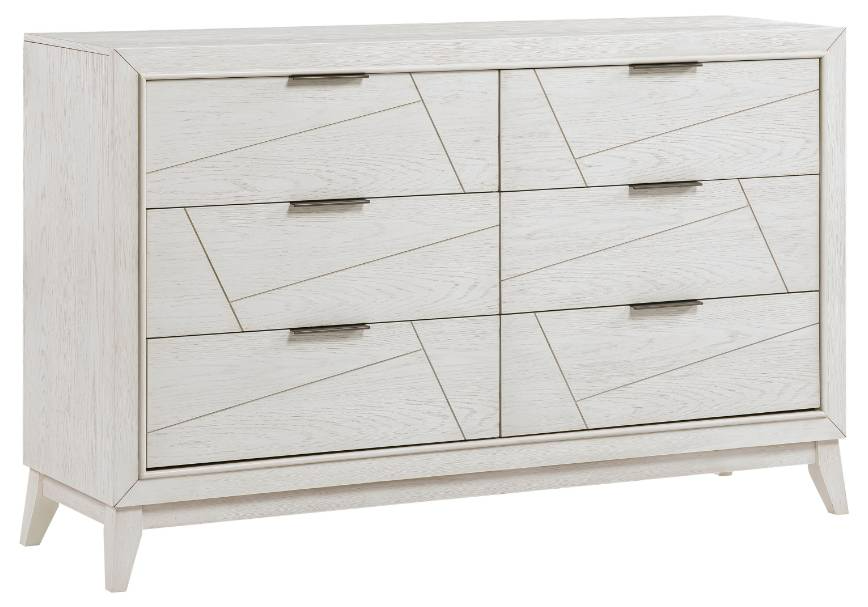 Bold geometrical styling is paired with unfettered modern lines to create the unique design of the Asteria Collection. An antique white finish highlights the collection’s oak veneer. Asymmetrical routing fronts the drawer faces for a dramatic accent to the collection.Read More