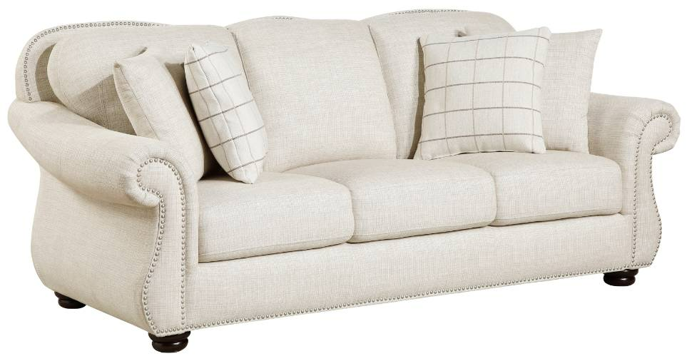 Upholstered in soft yet durable fabric, it seamlessly blends with a variety of décor styles, from traditional to farmhouse and transitional. Complete with coordinating accent pillows, this sofa enhances your space while providing a spacious and cozy seating experience. Built with a sturdy wood frame and turned bun feet, it ensures long-lasting durability and stability, making it the perfect centerpiece for your living room, den, or formal sitting area.