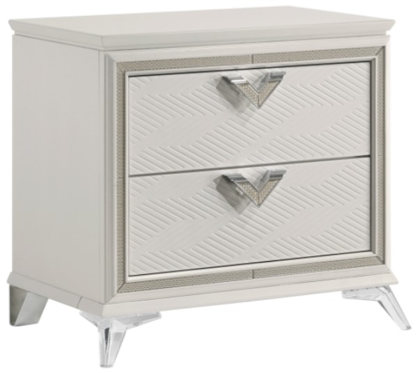 The two smooth-gliding dovetail drawers, equipped with ball bearing glides, provide ample storage for your essentials. The diagonal grain embossed drawer fronts add a sophisticated texture, while the polished chrome tone triangle pull handles enhance the modern aesthetic. This nightstand seamlessly blends functionality with high-end design, making it a perfect addition to any contemporary bedroom. Assembly is required, allowing you to easily incorporate this stylish piece into your space.
