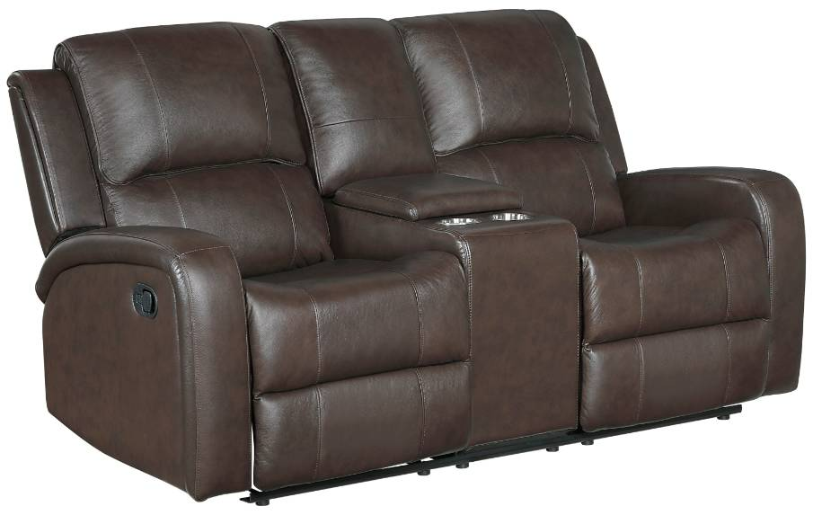 Homelegance Austin double manual reclining loveseat in brown leather upholstery, featuring plush foam over pocket coils and sturdy wood-plywood frame. Each seat reclines independently via pull-tab and flanks a center console with hidden storage and dual cup holders.Read More