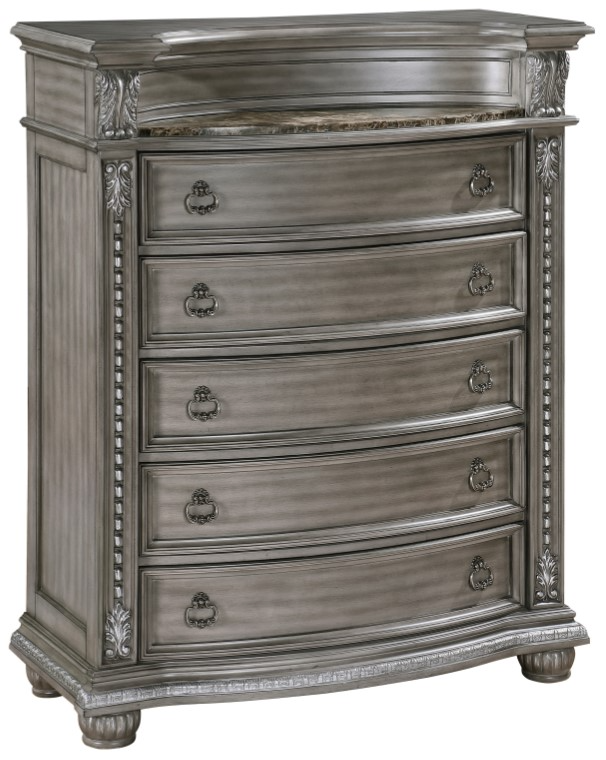 Antique pewter-finished knob and ring pull hardware fronts the drawers, and marble tops the piece. The gray finish, over acacia veneer, features subtle silver tipping for final luxurious accent.