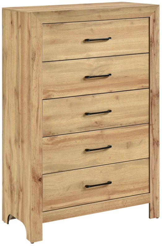 Optimize your bedroom storage with this elegant and space-saving 5-drawer chest, featuring a charming natural finish that brings a rustic touch to any decor. Constructed from a durable blend of faux wood veneer, wood, and engineered wood, this chest is built for longevity.Read More