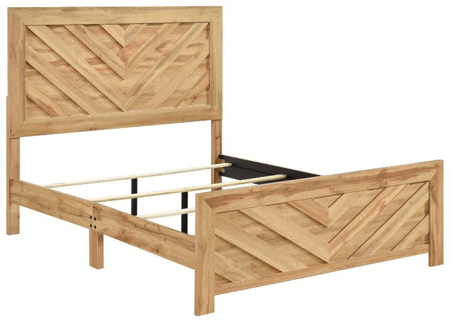 Modern lines and rustic styling are paired to create the look of the Corbin Collection. The 3D printed paper veneer’s texture is highlighted by a natural finish for a realistic wood look. A bold V-pattern defines the face of the bed's headboard and footboard, further lending to the unfettered design of the collection.Read More