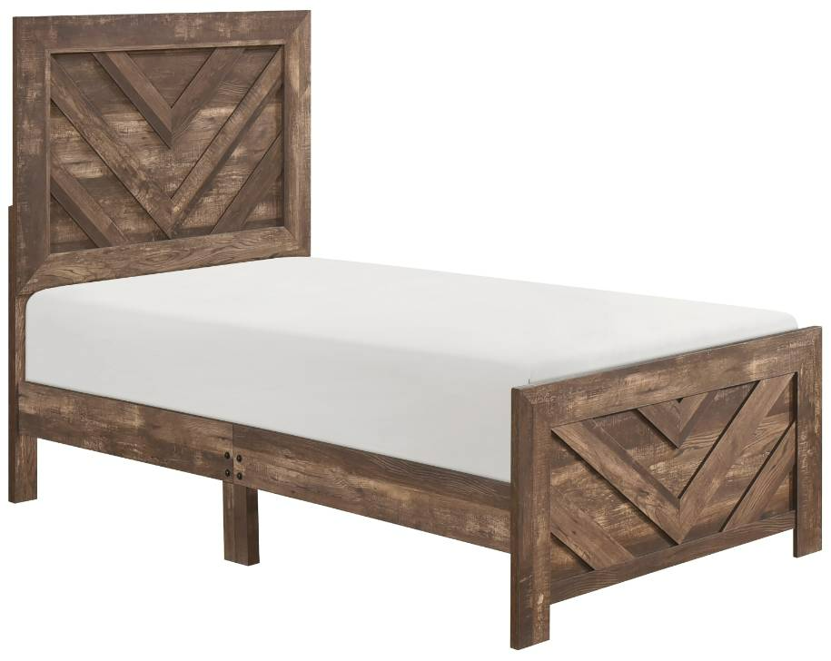 Modern lines and rustic styling are paired to create the look of the Corbin collection. The 3D printed paper veneer’s texture is highlighted by a rustic brown finish for a realistic wood look. A bold V-pattern defines the face of the twin panel headboard and footboard, further lending to the unfettered design of the collection.Read More