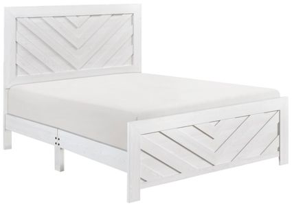Modern lines and rustic styling are paired to create the look of the Corbin Collection. The 3D printed paper veneer’s texture is highlighted by a white finish for a realistic wood look. A bold V-pattern defines the face of the California King panel headboard and footboard.Read More