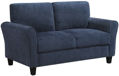 The sturdy solid wood and plywood frame ensures stability and durability for years to come. Its classic design is accentuated by elegant rolled arms and exposed feet with a sleek black faux wood finish, adding a touch of sophistication to any room. While some assembly is required, the result is a beautiful and cozy loveseat that will be a welcome addition to your home.