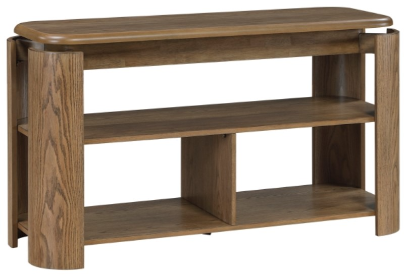 The rich brown finish and authentic oak veneer bring warm, natural aesthetic to any room, while the unique base with its clean lines and rounded edges creates a distinctive, architectural look. Its two open shelves provide generous space to organize books, media, and decor, making it the perfect blend of form and function.Read More