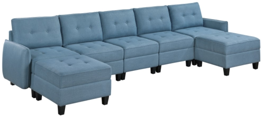 Maximize both seating and versatility with this blue textured fabric 7-piece U-shaped modular sectional, featuring dual ottomans and hidden storage beneath the seats for added convenience. This expansive yet space-conscious sectional, comprised of two one-arm chairs, three armless chairs, and two ottomans, boasts a solid wood and plywood frame, foam padding over pocket coils.Read More