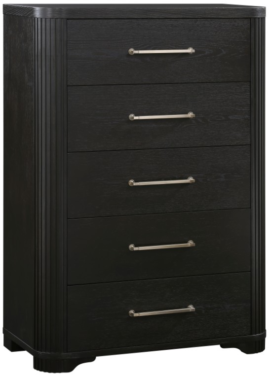 Elegant modern styling comprises the design of the Gilbert collection while drawing subtle inspiration from the art deco movement. The oak veneer of the collection features a charcoal finish providing a rich hue to the distinct wood grain. Polished brass-tone bar pulls center each drawer of the chest for complementing contrast.Read More