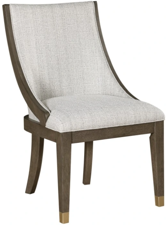 The wood framed side chair features beige linen-like fabric upholstery covering the seat and back, providing perfect contrasting complement to the brown finish of the collection.