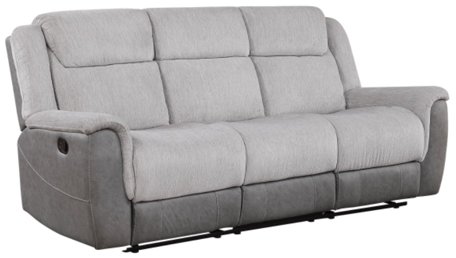 Enjoy superior comfort and modern style with this two-tone fabric reclining sofa, designed to enhance your living space with plush seating and smooth reclining functionality. Featuring a pull-tab manual dual reclining mechanism, high-density foam cushions, and padded armrests, this sofa offers exceptional lumbar and full-body support for maximum relaxation.Read More