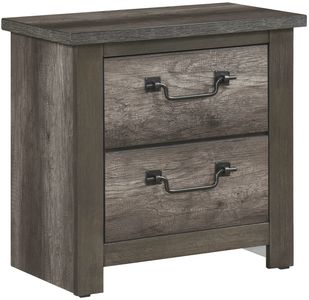Gunmetal-hued metal drop hardware fronts the drawers of the nightstand providing an industrial-inspired accent to the look of the collection.