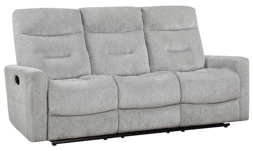 Your comfort is at hand in the design of the Lyndon Collection. The dual reclining ends of the sofa are engaged with a pull of the side-mounted tabs. Gray chenille fabric upholstery covers the plush, subtle modern framing, furthering your comfort, and serving as a neutral palette for your living room décor.Read More