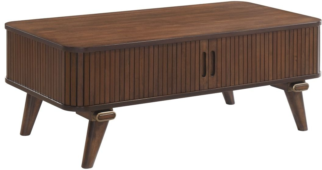 With a design that spans transitional, Mid-Century, and modern aesthetics, the Monroe Collection is in a class all by itself. Walnut veneer is accentuated with walnut finish for a classic hue to complement your casual living room. The modified a-frame base serves to support the rectangular top of the cocktail tableRead More