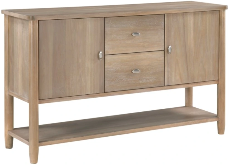 It offers ample storage with two smooth-gliding dovetail drawers, two side cabinets each with an adjustable shelf, and a bottom open shelf for display. The polished chrome tone knobs add a touch of elegance, complementing the server's warm and inviting aesthetic. This versatile piece provides both style and functionality, making it a perfect addition to any home.