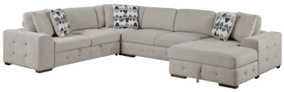 Create a spacious and versatile living area with this four-piece chenille U-shaped sleeper sectional, featuring a left-side two-seater with a convenient pull-out bed, an armless two-seater, a corner seater, and a right-side chaise with hidden storage.Read More