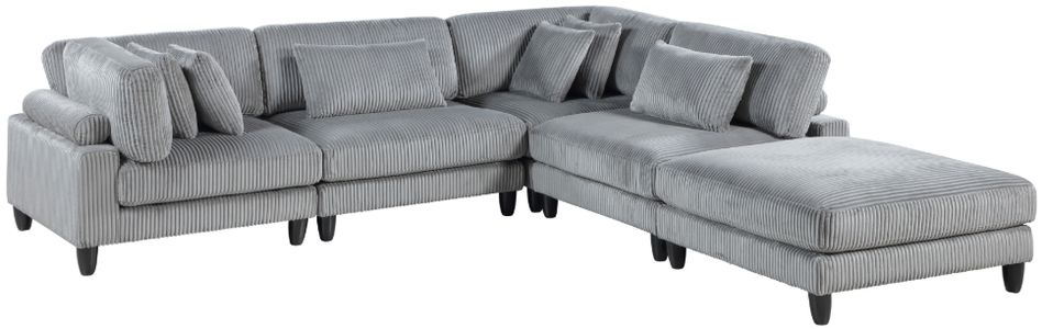 Create the ultimate customizable and comfortable living space with this gray corduroy 5-piece modular sectional, featuring a versatile ottoman for added relaxation and configuration options. This sectional boasts foam padding over pocket coils for exceptional support and soft corduroy fabric upholstery for a plush, cozy feel.Read More