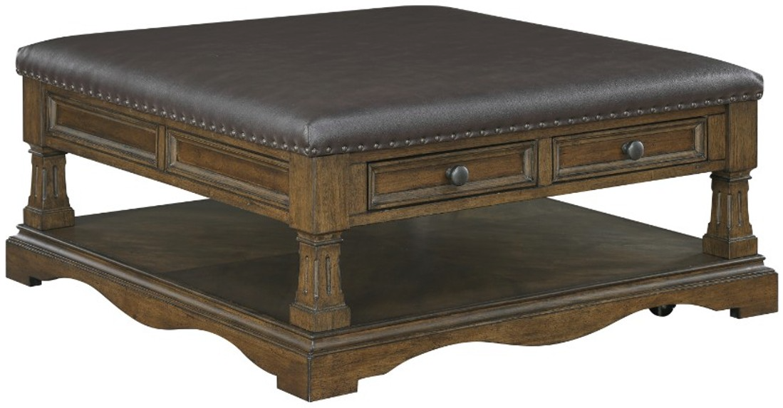 Enhance your living space with this multi-functional rustic square cocktail table that doubles as an ottoman. Crafted from a blend of cherry veneer, wood, and engineered wood with a rich brown finish, this piece features a plush faux leather upholstered top adorned with classic nailhead trim.Read More