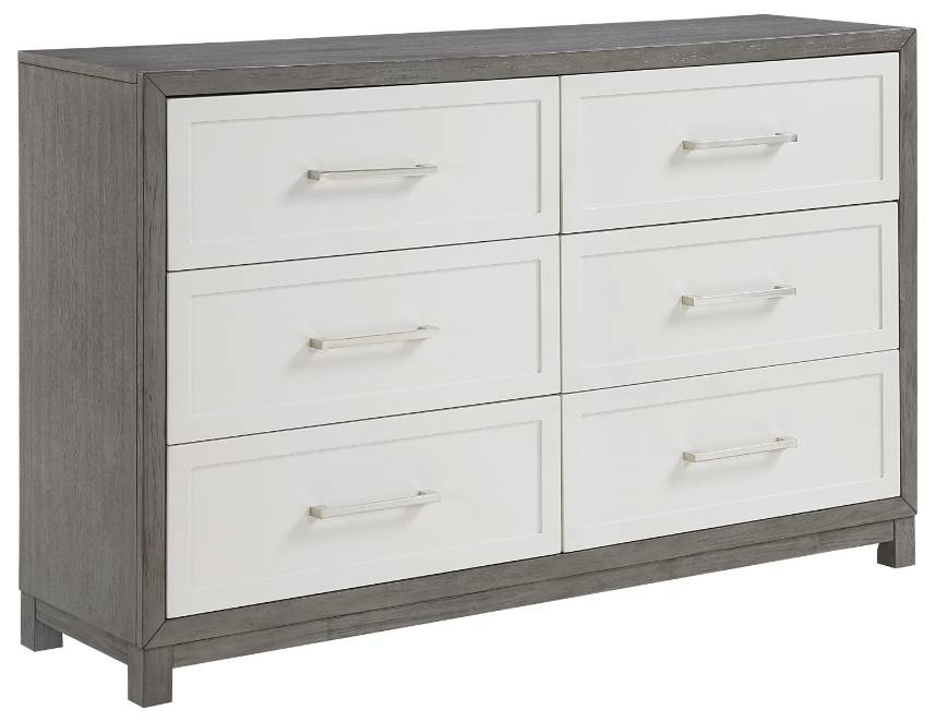 Add a touch of modern sophistication and ample storage to your bedroom with this two-tone 6-drawer dresser, featuring a unique ivory and gray finish crafted from okume veneer, wood, and engineered wood. This dresser provides ample space for your clothing and belongings.Read More
