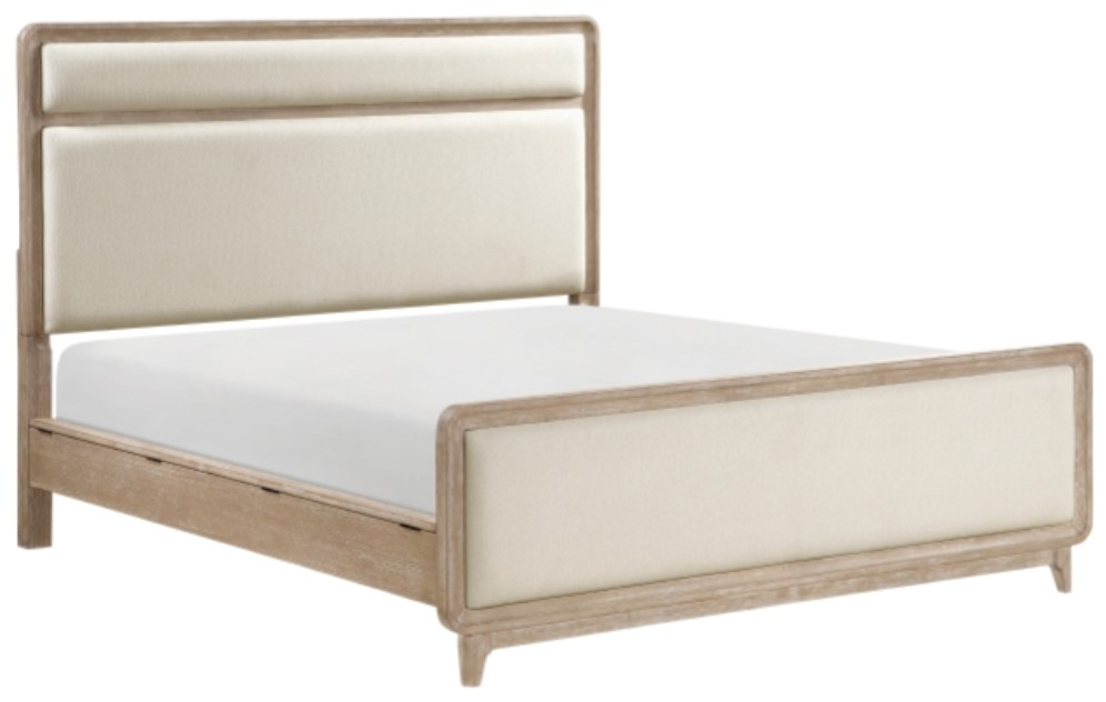 The natural finish highlights the beautiful wood grain, while the plush chenille fabric upholstery on both the headboard and footboard provides a soft, inviting touch. This complete set includes a stylish upholstered headboard, a complementary footboard, and sturdy rails, creating a cohesive and luxurious foundation for your sleep sanctuary.
