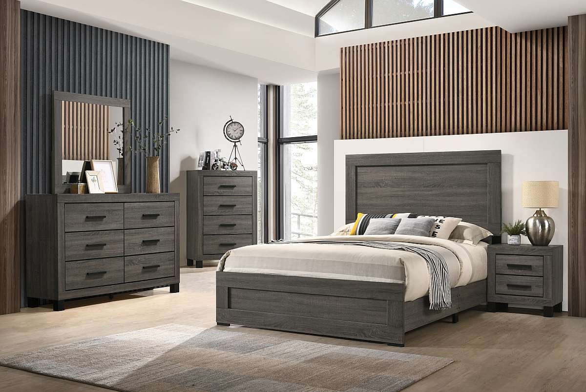 Queen panel bed in a grey finish with chest, nightstand, dresser and mirrorRead More
