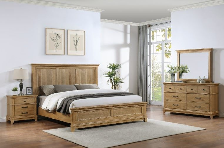 The Sunstone bedroom set blends warmth and elegance. Featuring a king panel bed, dresser, chest, nightstand and mirror, it’s crafted from rich honey-finished wood with stylish detailing, offering comfort and timeless charm.Read More