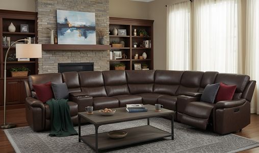 Sawyer 6 Piece Reclining Sectional in Chocolate with Power LSF Power Reclining Loveseat, Console, Armless Chair, Wedge , Power Armless Recliner, and RSF Power Recliner.Read More
