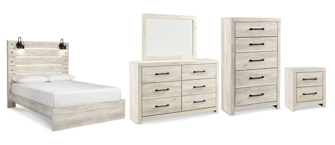 Includes panel bed (headboard, footboard and rails),6-drawer dresser with mirror, 5-drawer chest of drawers and 2-drawer nightstand