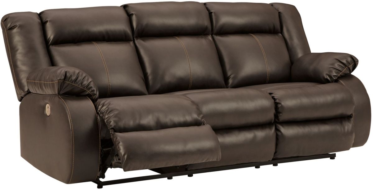 If highly contemporary looks and a heavenly feel sit well with you, rest your eyes on this reclining power sofa. Decadently soft, the easy-care faux leather upholstery is enriched with jumbo contrast stitching and dramatic cut-and-sew lines for fashion-forward flair. Radius cut arm frame adds cool, curvaceous interest. At your fingertips: one-touch power control with a zero-draw USB plug-in that’s not only convenient but also energy efficient. When it comes to high style at a down-to-earth price, this power reclining sofa really brings it home.