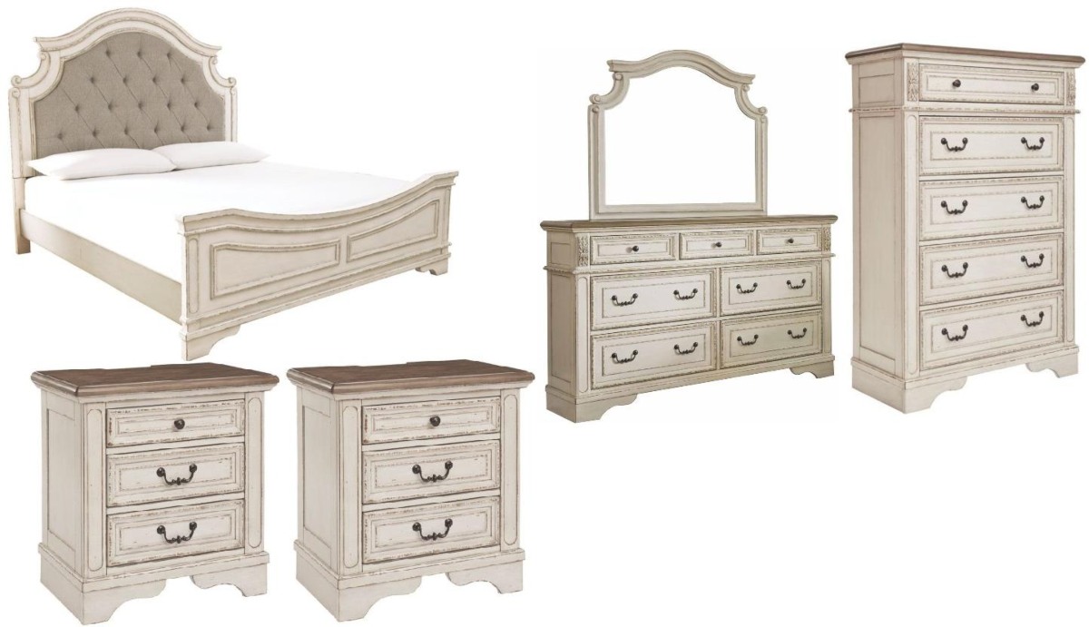 Elevating the art of traditional cottage styling, the Realyn dresser is your dream bedroom retreat realized. Antiqued two-tone finish blends a heavily distressed chipped white with a natural wood tone top for added charm. Assembly required for this product.
