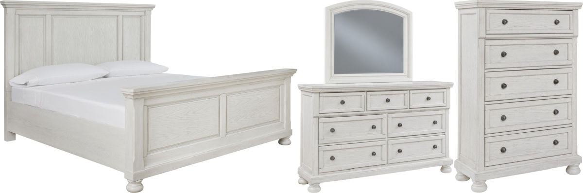 Includes California king panel bed (headboard, footboard and rails), 7-drawer dresser with mirror, and 5-drawer chest