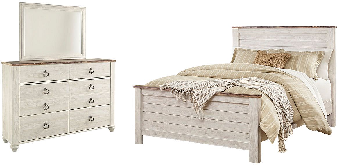 Make a charmingly rustic statement in your room with the plank-styling and replicated grain of the 3-piece Willowton queen panel bedroom set. Dream sweet on the queen bed frame, arrange your wardrobe in the 6 smooth-gliding dresser drawers, and check your reflection in the attached mirror.