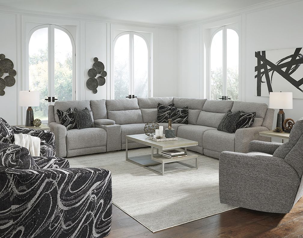Includes power left-arm facing recliner, console, 2 armless chairs, wedge, and power right arm facing recliner