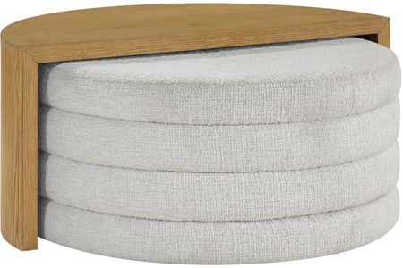 The ottoman, upholstered in 100% polyester cross-hatch boucle fabric in an eggshell hue, offers a durable, easy-to-clean surface that resists everyday stains and spills.