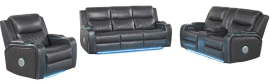 Transform your living room into a personal theater with the Luna Charcoal Power-Reclining 3-Piece Set, upholstered in smooth charcoal-gray vegan leather with elegant argyle quilting on seats, backs, and sides. Built-in speakers provide immersive, room-filling sound, while illuminated cupholders and subtle under-frame lighting create the perfect cinematic atmosphere.Read More