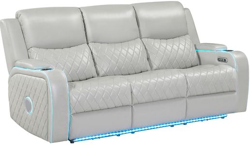 Relax in modern style with the Luna ice, upholstered in smooth, charcoal-gray vegan leather featuring an elegant argyle-quilted pattern on the seats, backs, and sides for a refined, high-end look. Effortless power recline lets you adjust the back and footrest to your perfect position, while built-in speakers create immersive sound.Read More