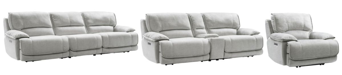 Fully Inclusive Set: The 3-Piece Modular Set includes the Olsen Silver Dual-Power Sofa (LAF Dual-Power Recliner, RAF Dual-Power Recliner, and Armless Chair), Loveseat (LAF, RAF, Console) and Olsen Dove Dual-Power Recliner. Each item also sold separately.