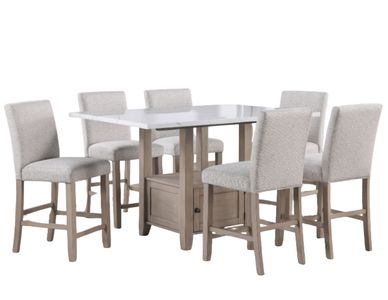 Hidden storage and an open shelf add functionality. Four 24-inch counter-height chairs feature gray upholstered cushions for comfort, solid wood legs for durability, and built-in footrests for support. With clean lines and transitional styling, Taylor complements both classic and contemporary spaces with ease.